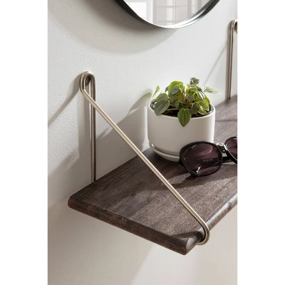 The Palone wall shelf is the perfect way to accentuate decorative accents while preserving your transitional aesthetic. Inspired by modern design, the Palone embraces a minimal look, featuring two slim brackets that allow the shelf surface to nestle in between. The two brackets are made of a robust iron and feature a polished silver finish, while the actual shelf is crafted from rich mango wood with a graywash finish. Each piece in the Palone collection is handcrafted by skilled artisans, making the finish and woodgrain of each piece distinct. The overall dimensions are 24 inches wide by 8 inches deep by 8 inches tall, and the wall-mounted shelf features a 10 lbs. weight capacity. That gives you plenty of opportunities to create a small bookshelf, display treasured decorative accents, or store household necessities. The 24-inch width fits next to the sink in your bathroom, over a couch in the living room, or decorating your bedroom next to a dresser. Hang the Palone shelf in a matter of minutes thanks to the pre-drilled holes on the back of the metal brackets.