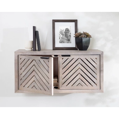 Store linen, blankets, and more in a Nordic-inspired wall cabinet from Kate and Laurel. The Mezzeta cabinet emphasizes artisanal craftsmanship, with a mango wood construction distressed and handcrafted in India by artisans. Since each piece is handmade in India, the Mezzeta is a true one-of-a-kind element to bring to your home. It also features a whitewashed finish to give it a vintage, antique look. The Nordic arrows also elevated the minimal Scandinavian design to blend into any boho decor. This wall cabinet’s overall dimensions are 30 inches wide by 10 inches deep by 14 inches tall, making it an ample storage utility that doesn’t take up too much space on your wall. The Mezzeta cabinet is fantastic for housing your blankets, towels, and other linens, or you can use it as a functional space for small plates, mugs, and cups. What you store is up to you! Your items will be secure thanks to the doors kept closed by magnetic clasps. The Mezzeta wall cabinet hangs on your wall in a matter of seconds thanks to the metal Z-brackets that are securely attached to the back of the wooden frame.