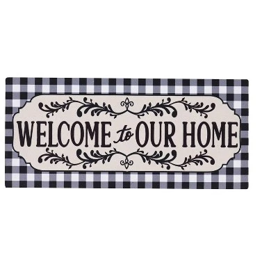 - The design featues a black and white checkered pattern surrounding a “Welcome to our Home” message.
