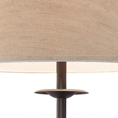 - Dark rust finish base and pole. Walnut finish wood end table-tray. Linen shade. 8- foot long cord.
