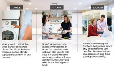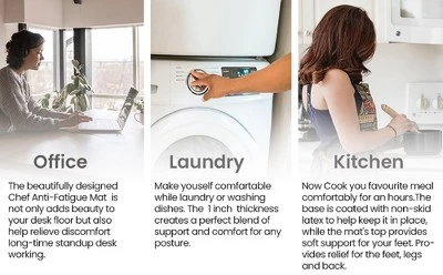 • NO SLIP: An ideal Anti- Fatigue should not only look pleasant but it should also keep the floor completely dry and prevent us from slipping. Our Nonskid backing holds the mat in place for extra safety.