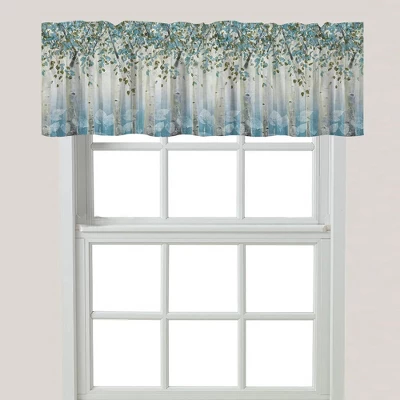 This nature inspired window valance, “Dream Forest,” features beautiful birch trees. Blue and gold hand painted leaves are clustered on top against a soft blue and ivory background. “Dream Forest” will surely create a serene look in any home.