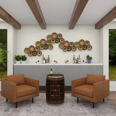 - •Multicolor metal wall design flaunting round plates with floral patterns