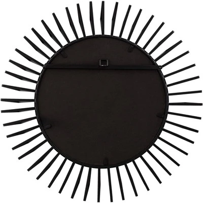 A Mid-Century inspired sunburst motif highlights this contemporary round wall mirror. From Uttermost and exclusive to Lamps Plus, the mirror boasts a dimensional frame of perfectly spaced metal rays, all in matte black finish that pops against most wall spaces. The center mirror adds reflectivity and brightness, perfect for an entryway, kitchen, or living room.
