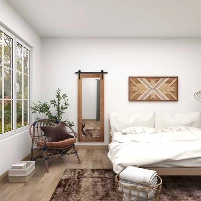 - Southwest style crisscross chevron pattern made from natural fir wood in muted white, gray, and brown hues